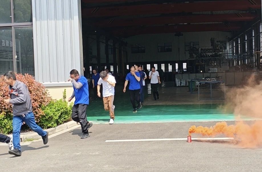 模拟起火逃生演练是本次演习的重要环节。演习模拟了酷尔生产车间突发火灾的场景,随着警报声响起,员工们用捂住口鼻,弯腰低姿前行,迅速有序撤离到安全区域。